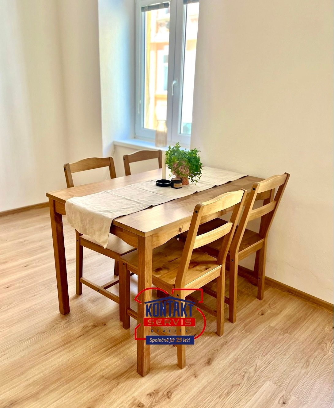 Je částečně zařízený (kuchyně, šatní skříň, šuplíková komoda).